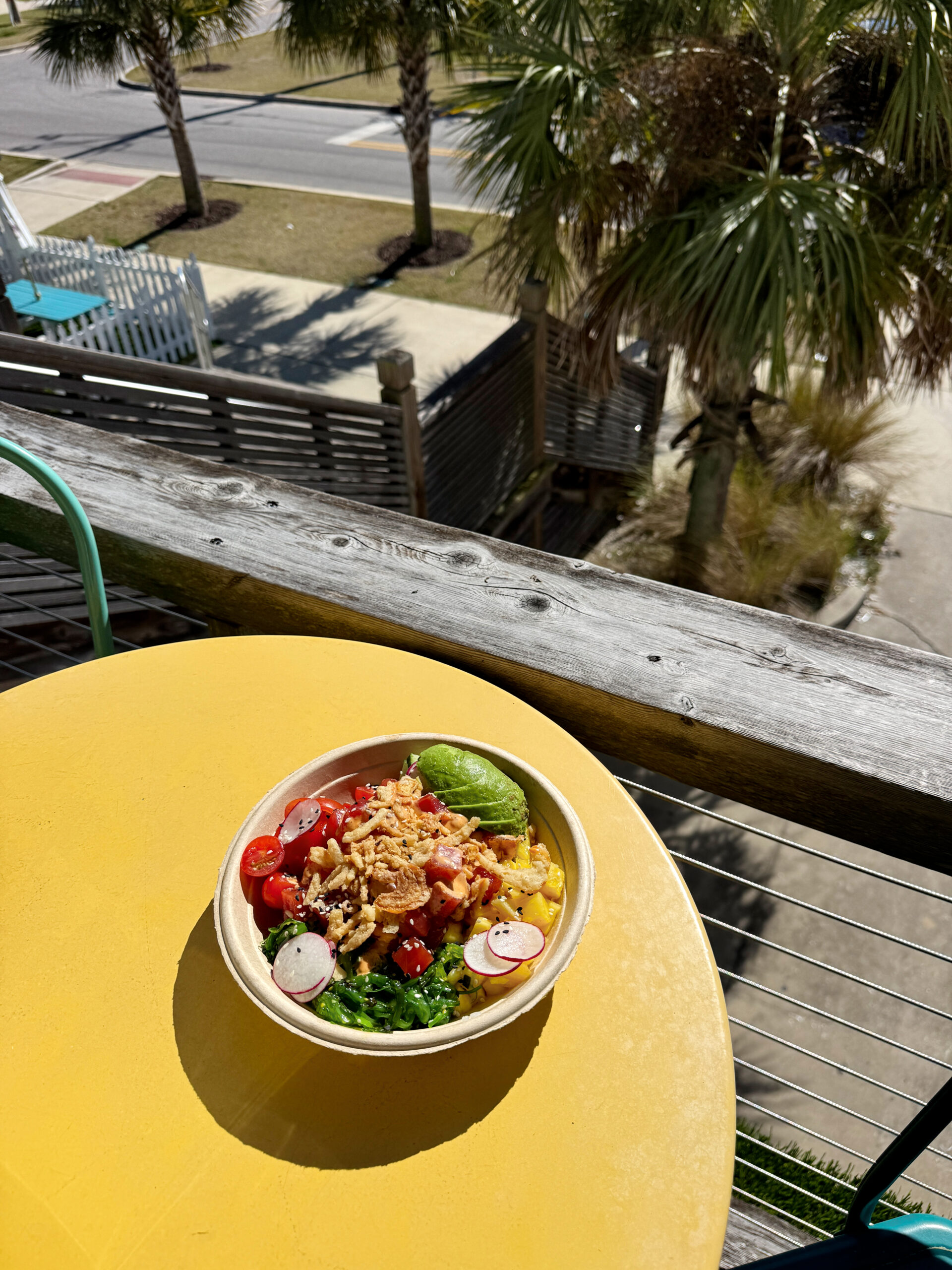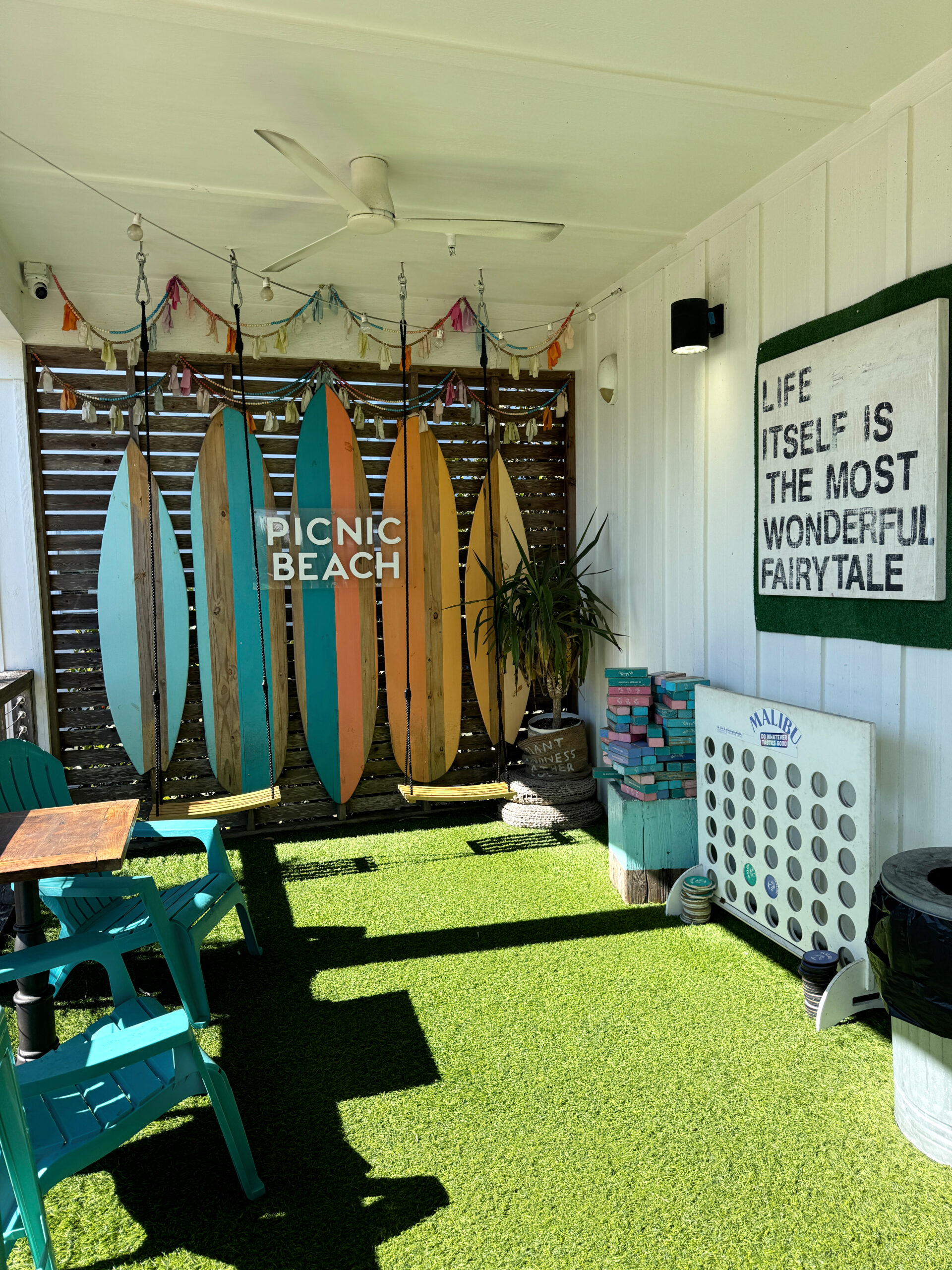 • Picnic BeachFun, colorful, and perfect for families. Casual coastal vibes with tacos, poke, and beachy eats. A perfect photo op spot, too with fun swings and a colorful surfboard wall!