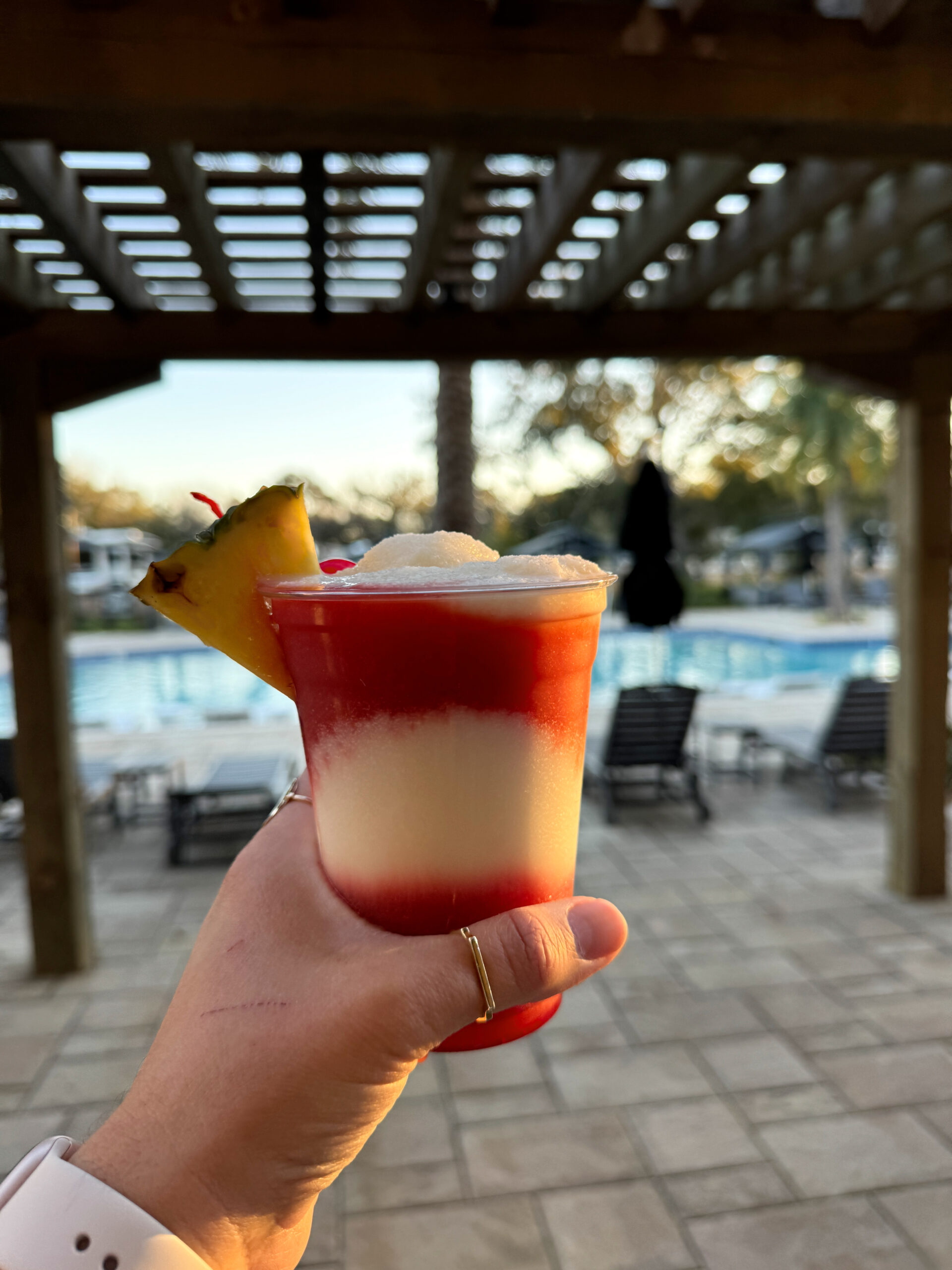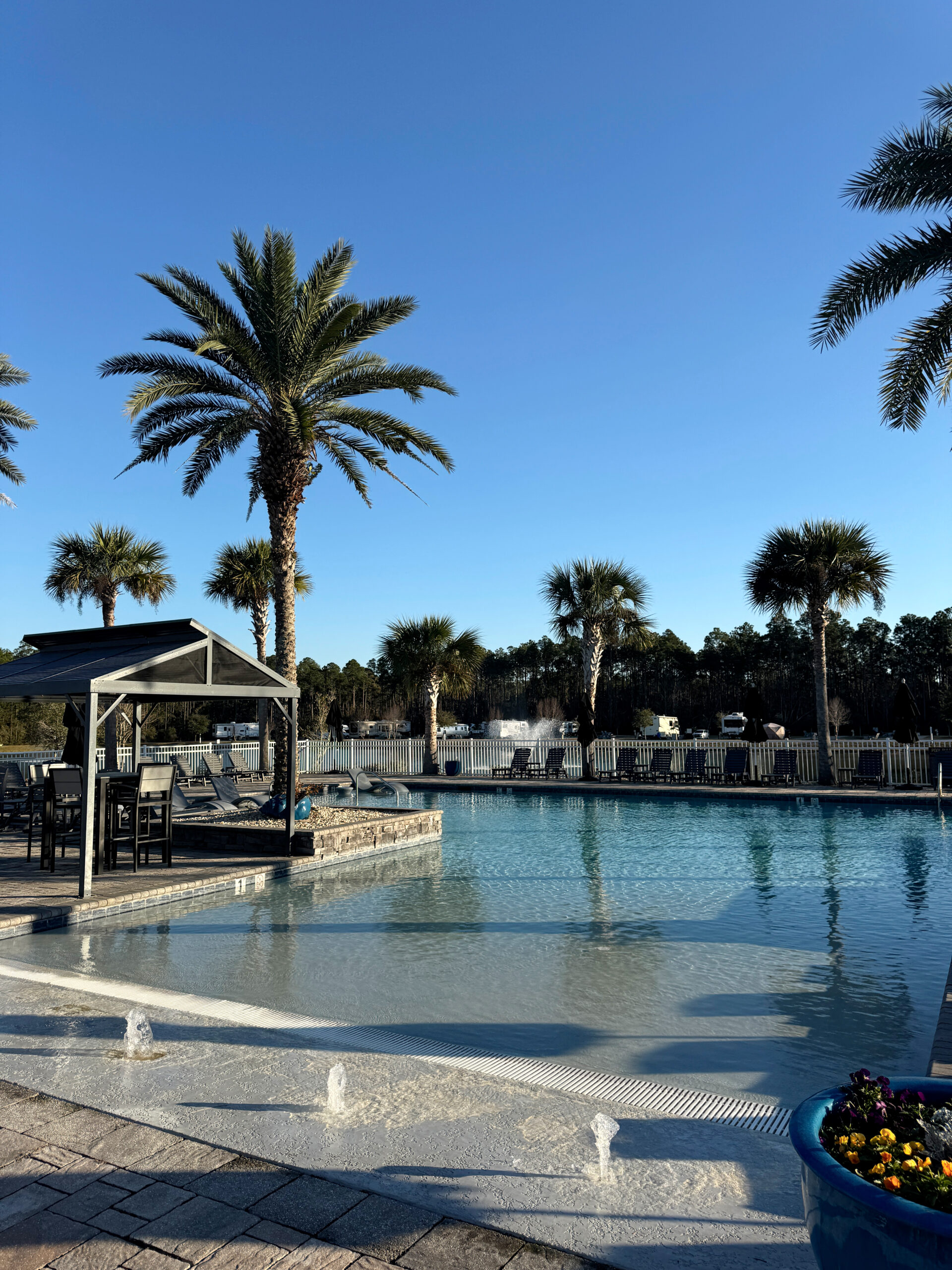 The spots were all paved, full hookups, and so spacious, which is always a plus for us. We also love amenities (who doesn’t?!), and here we felt we hit the jackpot! They have nature trails that connect to Gulf State Park, multiple pools, pickleball courts, sand volleyball, bags, an arcade, and even a full-service restaurant! We definitely hung out there multiple nights with our fellow campers and even joined in on some happy hours and games!
